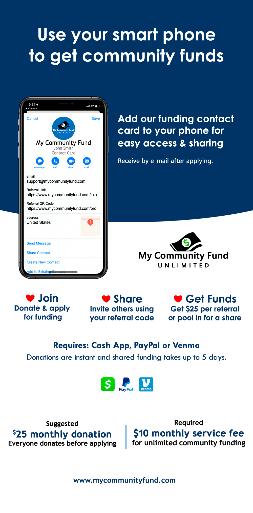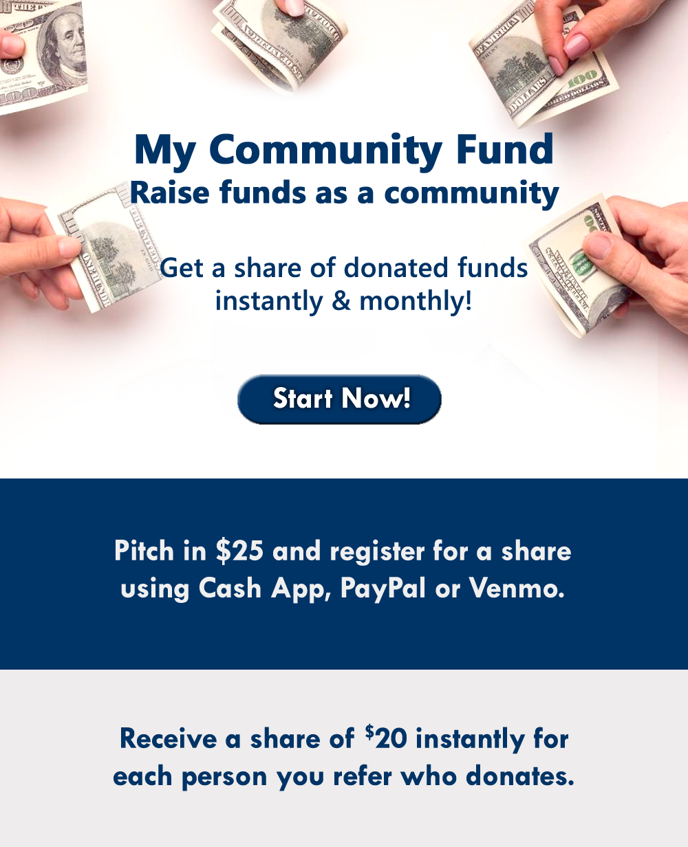 Must be 18 or older to participate. Major credit cards, debit cards, PayPal, Cash App and Venmo accepted. Must have a PayPal, Cash App or Venmo account to receive funds. All members of My Community fund are required to register referral codes to receive funding. All participants must commit to donating each month and pay monthly service fee to stay active.