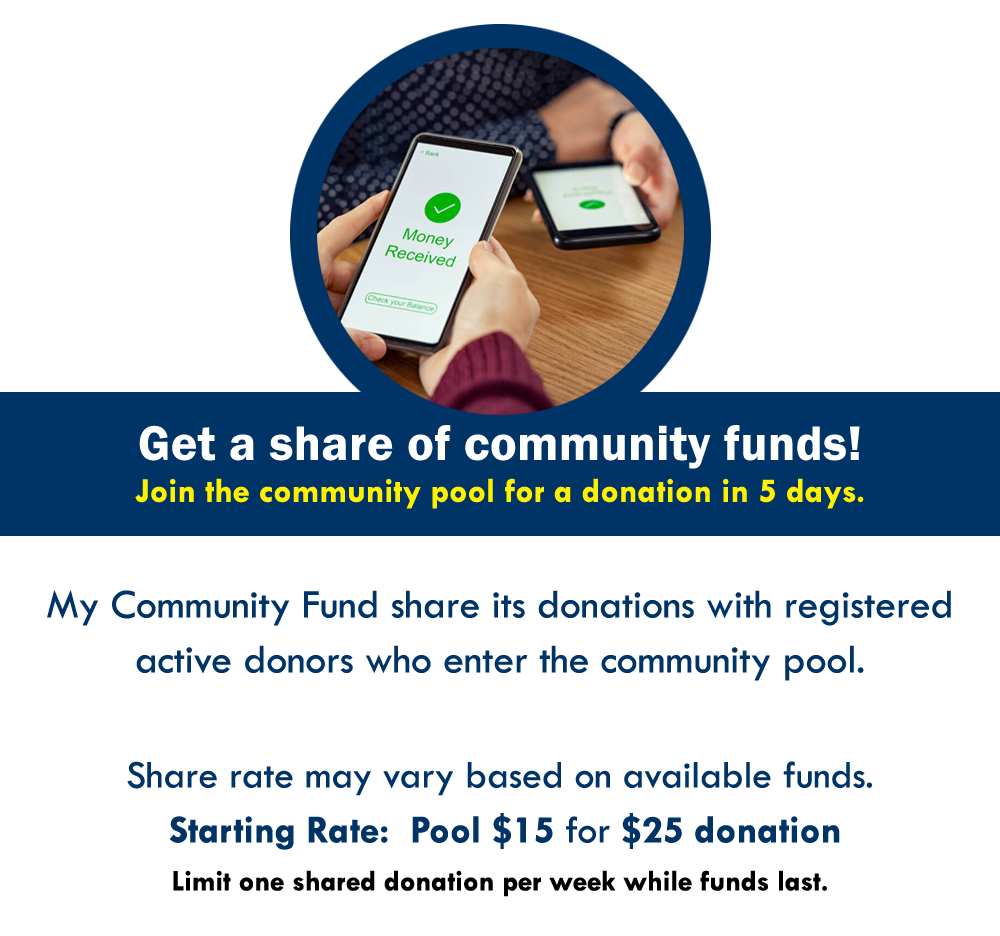 My Community Fund, its partners, sponsors or supporters are not responsible or affiliated with any services, products, campaigns, businesses, organizations or individuals who participate. My Community Fund is not associated with any payment services or merchants. All donations and service fees are non-refundable and final.