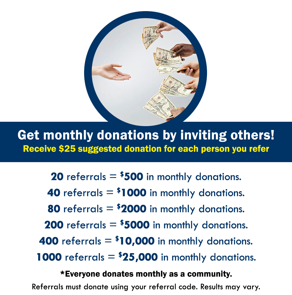 You can get instant and monthly donations as long you have an active referral code and pay monthly service fee of $10. When your referrals donate monthly, you receive monthly donations.